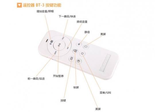 而蓝牙遥控设备方面,则提供了包括音乐播放、拍摄、音量控制等功能,通过上图就能很直观地了解到。