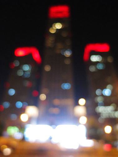 都说建筑是凝固的音乐,看见夜晚的银泰中心,这样的形容似乎更加贴切:虽然没有大面积纯玻璃幕墙的华丽,但一系列“方块”元素的使用让她在CBD地区显得独有风情。这样的建筑,点燃了自己的兴致。拿出S110,调到手动对焦模式。故意使建筑主体脱焦,将周围美丽的灯光虚化为圆形的光斑:她在这样的夜变得越发动人了……