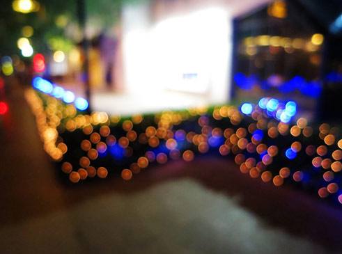 沿着旁边的一条小路安静地走。国贸商城周边的绿植被灯光点缀显得格外妖娆。又一次用故意脱焦的方式来表现它们的美好:朦胧与梦幻让喧嚣的夜也变得宁静。