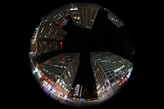 使用鱼眼镜头可以让拔地而起的高楼变成一个圆圈