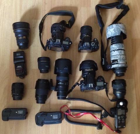 但是,同时做这两件事,有一个小小的问题在于,这两种拍摄的器材相差较大,因此,如何携行繁复的摄影器材,一直是我比较头疼的问题。户外的风大尘多、拍摄的时机紧迫,光线变化快,镜头切换频繁…… 这些都造成我必须使用多机身,多镜头。且不说需要的脚架、悬臂云台、单筒和双筒观鸟镜等物,单说机身和镜头的纯摄影器材,我就经常得带这么多: