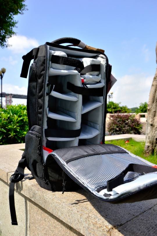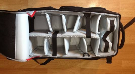 把第二层拉链拉开就可以见到MB20的大容量存储空间,这是可以放置专业机身连500/f4(遮光罩反装);专业机身连70-200/2.8镜头和3-4镜加闪光灯的超大大容量空间,大三元加闪灯当然是不在话下。值得一提的是,所有的间隔挡板都可以根据具体的器材设备来进行灵活的自由组合搭配,并且可以通过固定魔术绑带来加强摄影器材的装载稳定性和安全性。