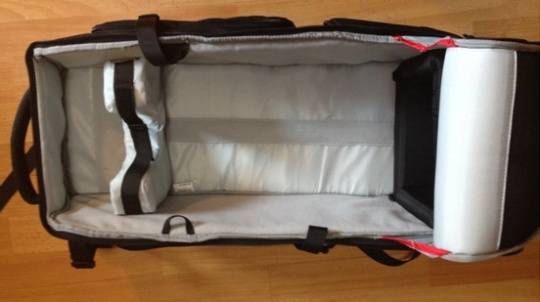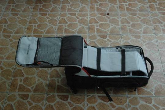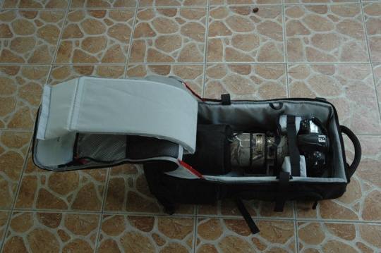 盖板翻起来的样子, 可以看到, 机身跟包还有3-5CM左右的间隙, 可以方便连同增倍镜一起安装。