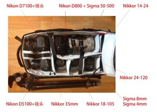 方案细节:两个闪光灯放入的前面的附件袋;其他9只镜头和3个机身正好全部放入包包