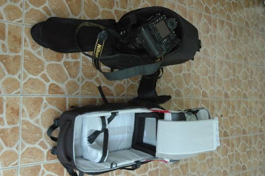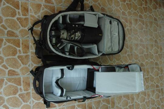 材质跟我现在正在使用的差不多, 有一个分离的防雨罩, 平时不用可以折叠起来当缓冲; 重量也不算太重, 双肩背负系统还是比较合身的(本人身高1.79M), 虽不如AW600的可调节背负系统,但结构简单, 重量也相应降低了。 重新整理了一下分割内衬, 正好可以放入200-400 加上D700连手柄, 或者D4. 摄影包的底部有一个圆筒形的内衬, 可以固定住大炮的前端; 后部有一个弯型的衬垫, 可以托住镜筒跟机身连接的部位。 包内部, 还留有 3-5CM左右的空间, 所以如果镜头与1.4X, 或者更长一些的2.0X增距镜一起安装放入, 完全没有问题。 原来相机包的6片小分割内衬, 通过自带的雌雄搭扣, 正好贴在包内部的两侧, 起到加强保护作用, 一点也不多余。