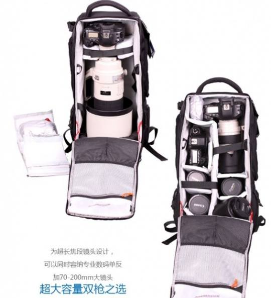 功能说明:* 背包系列,可放大型长焦镜头,也可以同时放置三剑客