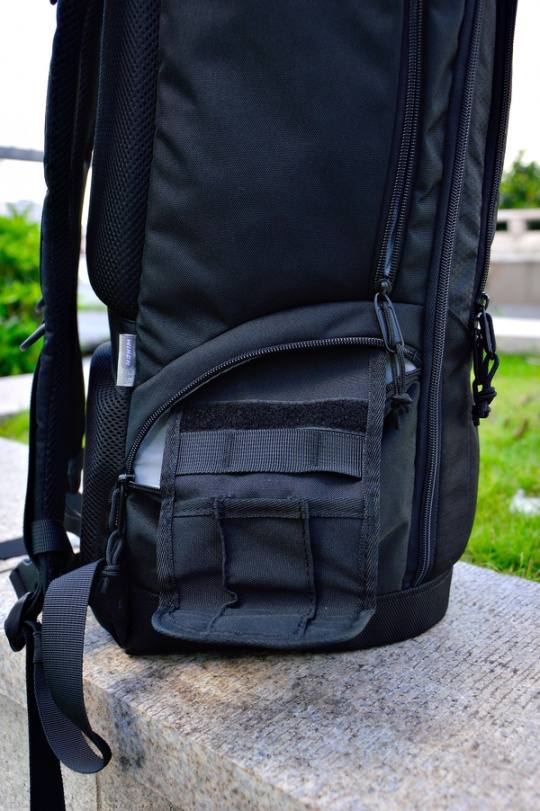再看看侧面的下部储物小袋里,除了上部的设计外,还隐藏有一个折叠小包。方便存放脚架的下部
