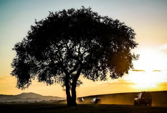 不知不觉,又到了夕阳西下的时刻,草原、孤树、车队、飞扬的沙尘构成了一幅驰骋纵横,我心飞扬的画面。