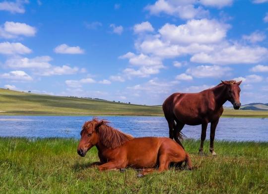湖边,几匹异常骏美的马,在那里一动不动的休息。好比天然的模特,引得我们频频拍照。打听当地人说:这里其实禁止牧马,这是部队里的军马,偷跑出来这里吃草呢。