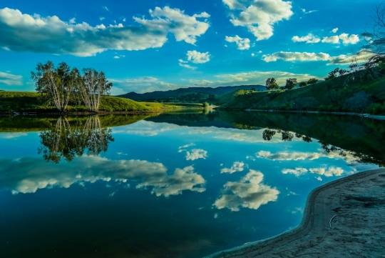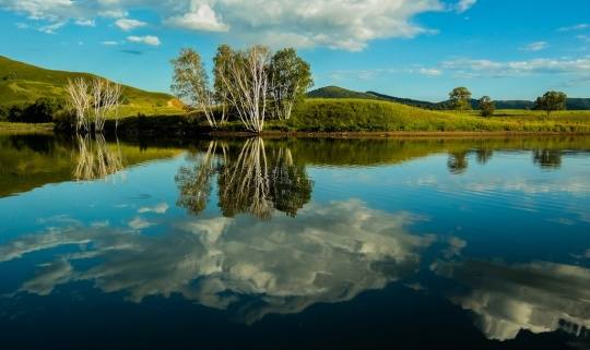 第二天,3点多出门去看日出,初上的旭日照射在充满雾气的湖面和草坡上,也照亮了山坡上的小树.