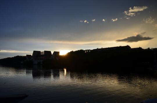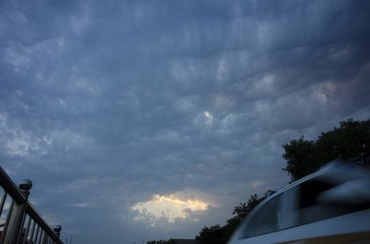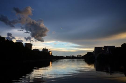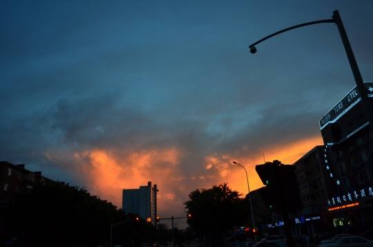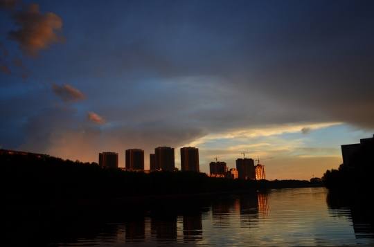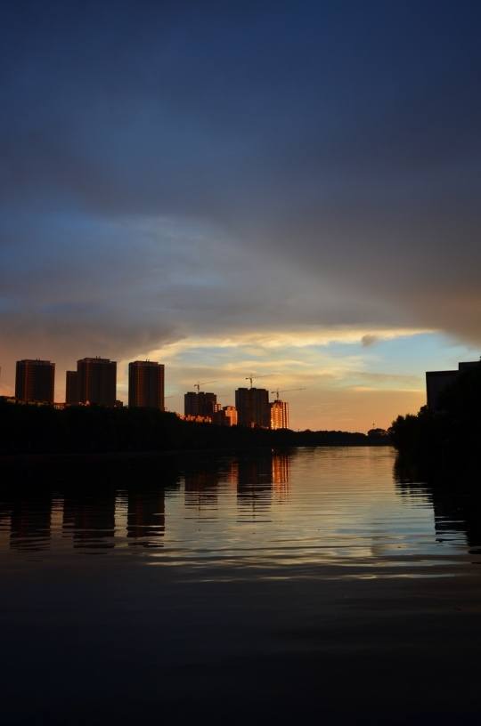 傍晚突降雷雨,临近7点雨势渐停,恰巧此时赶上夕阳西下,因为刚下过雨,天空仍盘踞一些乌云,夕阳透过云层颇为漂亮,临街河水将这一景象倒影下来。此时编辑将随身携带的记录下这美妙时刻。