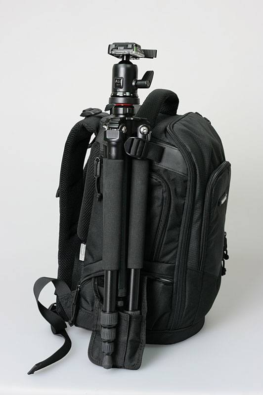 包身右侧是脚架固定装置,脚架袋在不需要使用的时候可以折叠起来藏于包侧,保证了摄影包的整体简洁。但是上方用于固定脚架的绑带没有活动开关扣,所以如果需要调整绑带的宽度,操作起来会比较麻烦。
