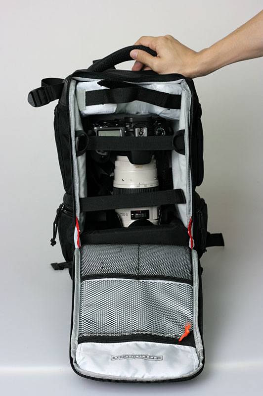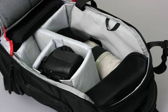 如果放上隔板的话,MB10的空间也足够放置一支70-200mm镜头,一台机身以及两支标准变焦镜头或闪光灯也绰绰有余。