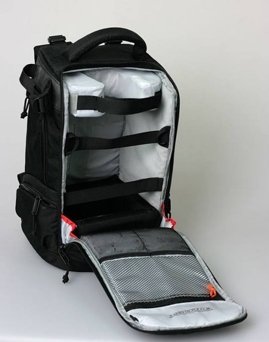 再来看看主舱的设计,拿出所有活动隔板后,空间还是非常充裕的,即使是MB10也能装载机身配300mm F2.8或者是400mm F4这样的镜头,70-200mm F2.8就更加不在话下了,此外镜头保护圈和镜颈托垫厚度约3cm,专门为长焦镜头设计。