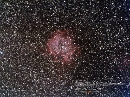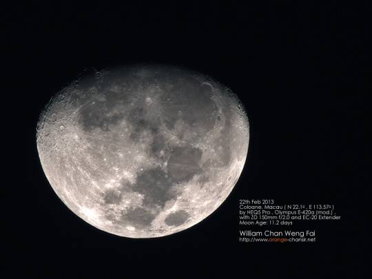 使用移除了红外线滤镜的 E-420 和旧版 ZD50-200mm f/2.8-3.5 拍摄。 ZD50-200 与 ZD12-60 被誉为 4/3 的「紫青双剑」,可是到了天文拍摄这个题材, ZD50-200 的缺点相当明显:像场弯曲严重,层次及锐利度不足,始终变焦镜头不及定焦镜好是硬道理。