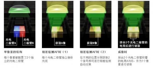 普通的图像感应器,在成像时,通常每个像素只配置1个光电二极管,输出时由1个光电二级管反应信号,进行一个像素的输出。 Dual Pixel CMOS AF则在每个像素中集成2个互相独立的光电二极管,且对应同一个微透镜,并同时捕捉两个时差图像,在拍摄图像时,两个光电二极管又将汇合各自的图像信号作为一个像素进行输出。