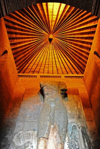 我穿过残垣断壁间的门洞,迈过后面坍塌的墙基,在这千年前的遗址间悠然跨越,漫长的历史岁月在此刻已被压缩成短暂的瞬间。这就是著名的波隆纳鲁瓦古城。信步走进一座寺庙,我不经意间抬头发现这个颇为壮观的穹顶,它被我非常喜欢的一片暖色调光线包围着,让我感受到一种奇妙的神圣庄严。这一刻触发了我的拍摄灵感。我举起EOS 700D相机,仰头准备拍摄穹顶,可因为光线较暗,又没带三脚架,固定相机成了当前的难题,此时突然想起相机具有屏幕翻转和液晶监视器触控功能,何不试试呢?于是将相机放到地上,对准穹顶找好角度,轻触监视器,很快轻松地完成了对焦与拍摄,得到令人惊叹的细腻画质