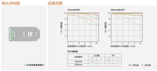 从图中可以看出70mm端F4.0全开光圈下锐度不错,收缩到F5.6-F8.0呈现最佳效果,而400mm端从F5.6全开下就表现不错,F8.0-F11属于最佳范围,由于这款镜头最大光圈偏小(F4.0-5.6),从全开光圈开始整体锐度都保持的不错,不过光圈缩小至F16之后锐度下降较为明显,建议用户使用这款镜头慎用小光圈。