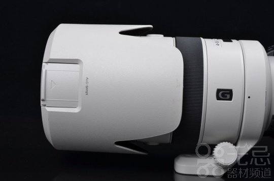 与这支镜头搭配的还有一个白色莲花瓣遮光罩。此遮光罩的内表面是绒绒,左侧保留了方便拨动滤镜的窗口(譬如使用CPL滤镜)。和α99搭配时,戴上遮光罩后的样子还是非常威猛的。