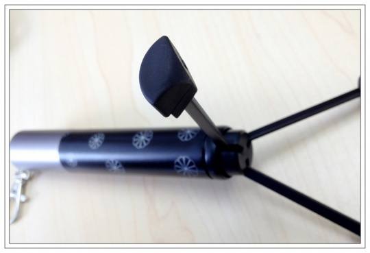 手机如何固定,是个难题。要夹得稳,又要轻便。一体成型的塑料架很牢靠(图片11),嵌入和脚架的连接,(图片-12)。顶端有橡胶拉扣(图片-13),底部有高密度海绵(图片14),以保护手机。如果要挑个刺,弹簧的力量比较大,顶部橡胶拉扣的设计似乎用不了几次就会断。我肯定是直接推上去,结果第一次松开时候,被夹了一下。