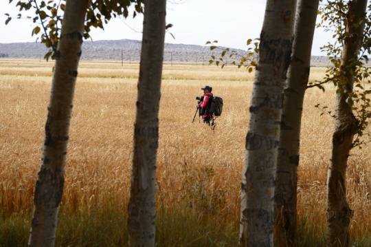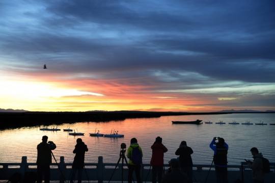 就在他考虑要不要换个地方试试运气时,仿佛听见远处有人说话。渐渐地,人声越来越近,透过黎明微弱的光线看去,隐约有二十来个人的身影。“这么早,谁会来这里?”等他们走近了,才发现每个人都背着摄影包,扛着三脚架。原来是搞摄影的,难怪!在可鲁克湖边,经常能看到摄影人来拍摄日出日落,但一下子来这么多拿着大个相机的人,还真是少见,有人相机前面的镜头竟像炮筒那么粗,这些人整天背着大包小包到处拍照,不知道图什么,真搞不懂。