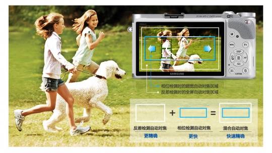 当然这只是三星的一步改进。更大的亮点是NX300还采用了混合对焦系统。就是相位对焦与反差对焦相结合。混合自动对焦系统结合了相位检测和反差检测自动对焦,可以更加快捷、精准地自动对焦。相位检测自动对焦能在瞬间确定相机与拍摄对象的距离,而反差检测自动 对焦可以通过检测图像反差进行焦距微调。混合自动对焦系统使快门延迟的时间缩短到最小,可以让相机以更快的反应速度拍摄难道得拍摄瞬间。