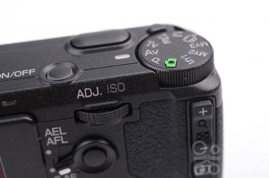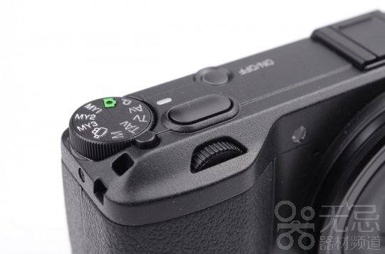 相机顶部, 理光GR的拍摄模式转盘上,除了自动/AV/TV/P/M常见曝光模式和MY1/MY2自定义模式,这款相机还增加了以前仅在PENTAX数码单反相机上采用的快门/光圈优先自动曝光模式(TAv)。该模式下拍摄者可手动设定的快门值与光圈值,自动匹配适当的感光度进行自动曝光。TAv出现在理光相机上,也算宾得、理光合并后在产品上出现的一点变化。