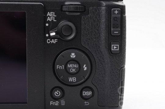 相机背面,是理光GR变化最大的地方。该机加入了AF功能按钮/拨杆,拨杆设置为C-AF时,用户可以通过按住AF按钮方便针对运动物体对焦,同时适时按下快门,保证画面清晰。用户还可以通过自定义功能将连拍摄功能与C-AF模式相结合使用。由于这个拨杆的出现,让回放按钮挪到右侧缩放按钮下面。此外,背面的方向按钮也增加了WB功能,方便用户直接调取该设置。