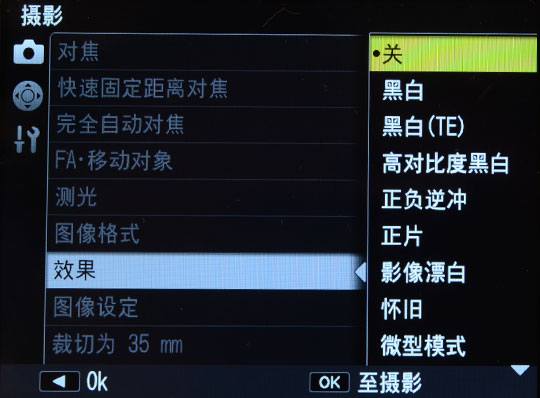 菜单界面方面,理光GR也基本继承GR DIGITAL IV的设计。前文曾提到,该机可以直接通过按侧面的特效按钮选择使用。本次GR还加入了三种全新的效果:复古(怀旧)、高色调、微型模式。加上以前产品菜单中黑白、黑白(TE)、高对比度黑白、正负逆冲、正片、影像漂白。丰富的选择方便用户使用。