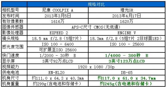 前文提到理光GR相当于尼康COOLPIX A完整进化版,所以有些规格是非常相似的: