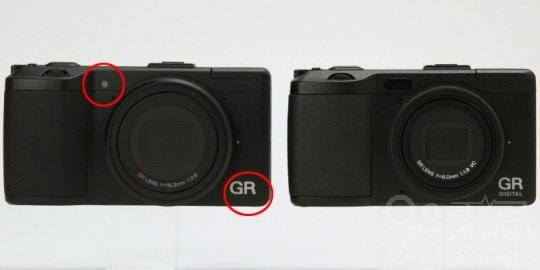 首先是正面,理光GR除了右下角型号不同,最大不同是镜头左上角,理光GR没有GR DIGITAL IV的外部AF感应器,仅保留AF辅助灯。