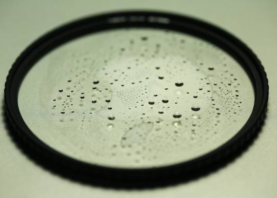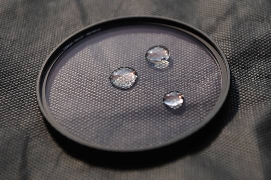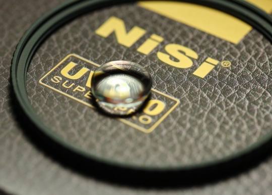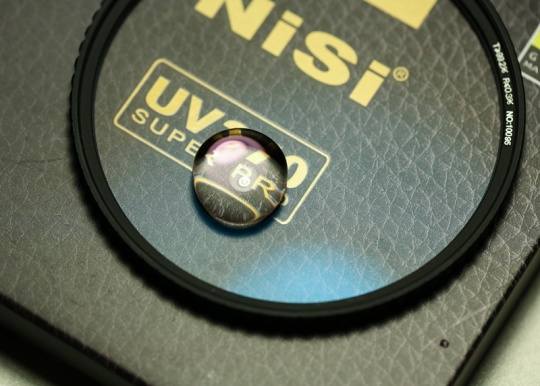 为了更清楚的观察水滴效果,采用了黑色背景,通过测试看出,当水滴落在UV镜片上呈滚珠状态,经过特殊处理的镜片表面的防浸润效果非常明显。经过简单擦拭后,水迹消失。由此可见NiSi UV镜在防水方面表现良好。