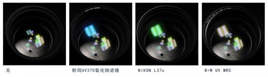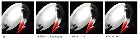 耐司UV370氧化铈滤镜与NIKON L37c、B+W UV MRC镀膜比较,由于膜系的不同,呈不同的反射色,程度相差不大,偏中。