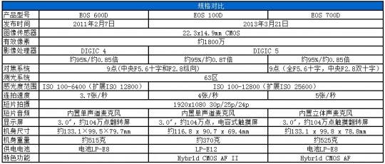 2013年3月底佳能发布了一款EOS史上最小的数码单反相机EOS 100D。EOS 100D采用1800万像素CMOS图像感应器、DIGIC 5数字影像处理器等,配置上基本继承了EOS 600D的主要性能。下面我们可以看一下100D与700D、600D的规格对比: