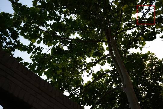 大光比逆光下,我们观察一下叶片交接、栅栏部分。从图中可以看到这款镜头无论18mm端还是35mm端,全开光圈下都存在紫边,收小光圈紫边可有一定减轻,f/5.6或f/8后基本消失。