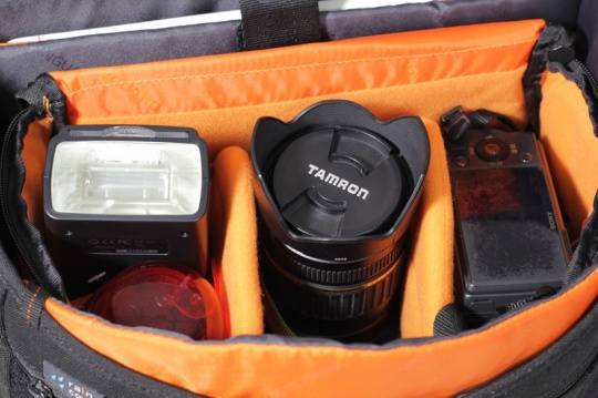 内胆的储物能力是比较充足的,我们测试的时候是存放了一台带标准变焦镜头的单反,一支闪光灯、一支定焦镜头、以及一台微单和一套清洁套装。不过如果想携带70-200那种长焦镜头,VOJO 28则不太合适。但携带广角镜头和标准变焦镜头肯定是绰绰有余的。