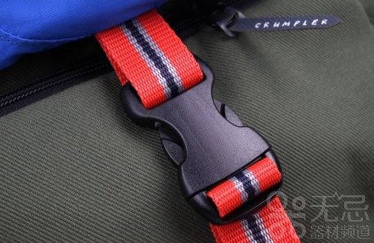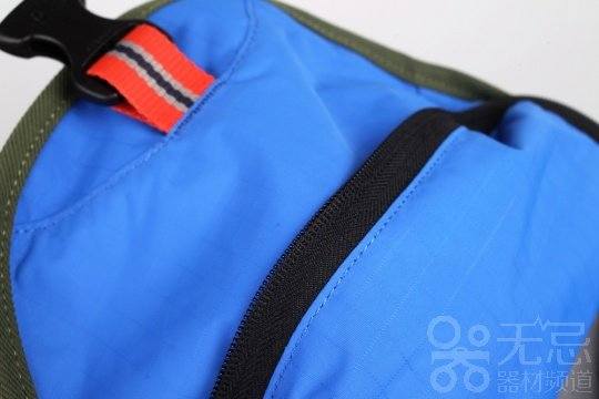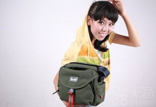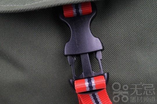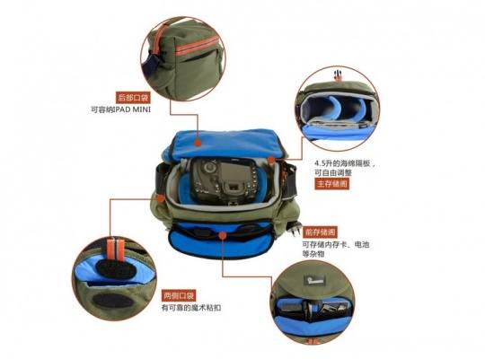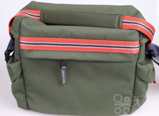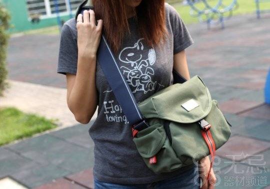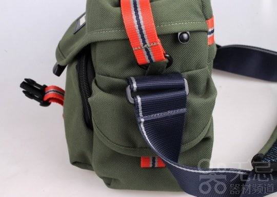包的主体颜色为绿色,为了避免色调过于单一,设计师还特意加入了一条橙色的色条,一个是为了装饰,另外这条橙色色带还是开启摄影包的卡扣带。