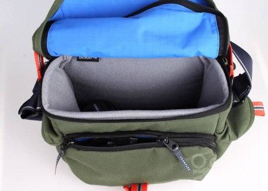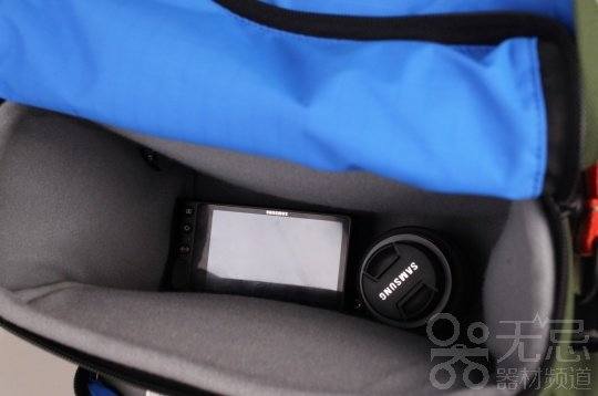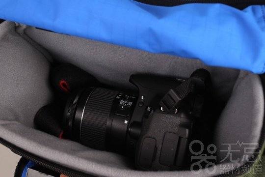 下面我们就说说这款包的存放器材的主空间吧。前面已经提到,我们只需要把顶盖周围的拉锁拉开就可以看到主空间了。说实话,由于受到了整体设计大小的限制,这款包的存贮空间并没有想象中的大。当然我们也说过,这款包定位于那些不喜欢携带太多东西出行的人,因此过于大型的摄影器材并不适合这个包。