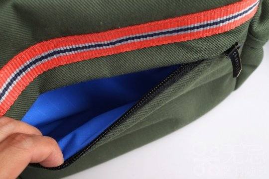 打开之后发现这两个小口袋不大,可以用来放一些小东西。也可以放进去一罐可乐。不过这里笔者还是突发奇想,把一只小型镜头放了进去,竟然也没有问题。看来如果你是个微单控的话,这两侧的空间完全可以再多放两只镜头。