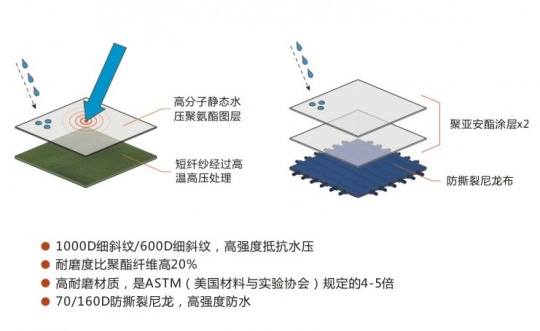 这次哨兵系列产品首次与军工连上了关系,为了迎合哨兵的主体,使用了耐磨强度很高的材料,这种材料也是美国军队所使用的。它的好处就是高耐磨性,比过去使用的材料要提高20%左右,另外它的一大优点就是分子密度高,抗水性能也很好。一般的水滴或者小雨啥的也有不错的防护性。