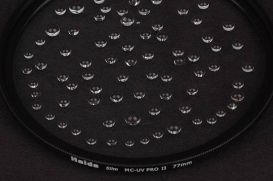 MULTI-COATING多层镀膜是目前主流UV产品中比较多使用到的一种技术,从图片我们可以看到,水滴在海大PROII MC UV上形成了明显的颗粒状态,这种多层镀膜技术可以较为有效地防止水、油污、指纹和一般砂尘对镜面产生伤害。此外,由于多层镀膜中还包含了多层的减光膜,因此据官方数据显示,PROII MC UV的反光率被控制在4%以下。而且滤镜正反面也镀有多层硬质增透膜,因此滤镜在420-700mm的透光率为99.2%以上。