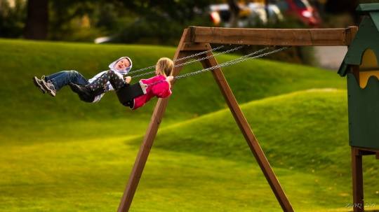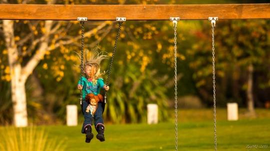 Hasselblad(Zeiss)300mm/F2.8 SA镜头,新西兰南岛的瓦纳卡镇,2013年4月。那个布娃娃对小女孩而言相信很喜欢很重要,不然为何要夹在腿间一起荡秋千?这样做有点难度。能与所爱之物或所爱之人一起玩乐,这点难度就无须计较了吧?貌似我们摄影人不远万里登高一拍也是这样?