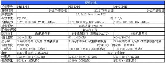 奥林巴斯PEN E-P系列作为PEN旗舰产品,更新周期为两年。此次E-P5并没有像E-P3那样和E-PL、E-PM两个系列产品一同发布(E-PL6国内未发布),而是选择在E-PL5、E-PM2发布后推出(2012年9月)。我们知道奥林巴斯在2012年接受索尼注资,最直接的影响就是奥林巴斯的数码相机将大量采用索尼提供的图像传感器,OM-D E-M5成为第一个摆脱松下1230万像素Live MOS传感器的产品,随后E-PL5、E-PM2也顺理成章采用了新的1600万像素Live MOS传感器。奥林巴斯E-P5不可能超越E-M5,所以也依旧沿用这块图像传感器。那么奥林巴斯E-P5又能有什么过人之处呢?下面编辑将E-P5与E-P3、E-M5的规格进行对比: