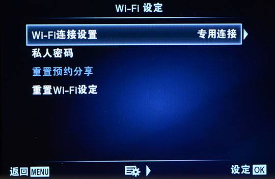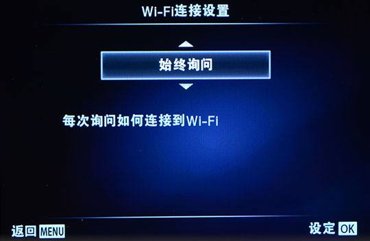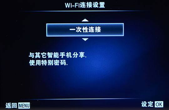 具体设置,我们可以先看看菜单,在Wi-Fi连接设置-Wi-Fi连接设置中,分为专用连接(连接至智能手机)、一次性连接(与其它智能手机分享,使用特别密码)和始终询问(每次询问如何连接WiFi)。默认情况下为专用连接,如果通过“一次性连接”可以浏览带有分享标记的照片,也可以方便地分享这些照片。