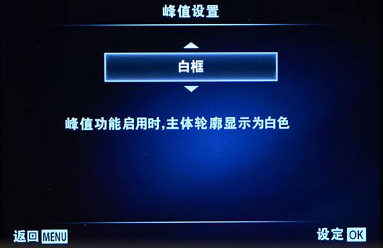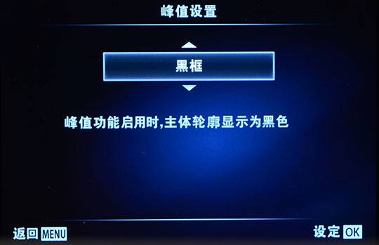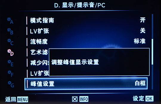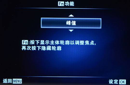 而按钮功能Fn或L-Fn均可自定义为峰值,Fn默认为Live 实时指南,设为峰值后,按下Fn显示主题轮廓调整焦点,再次按下隐藏轮廓。该功能与此前介绍的峰值不同,可以在转接手动镜头时使用峰值显示。此外,被对焦区域的合焦轮廓可调节,在“D.显示/提示音/PC”中有峰值设置,我们可以调节峰值显示,有白框和黑框两种。