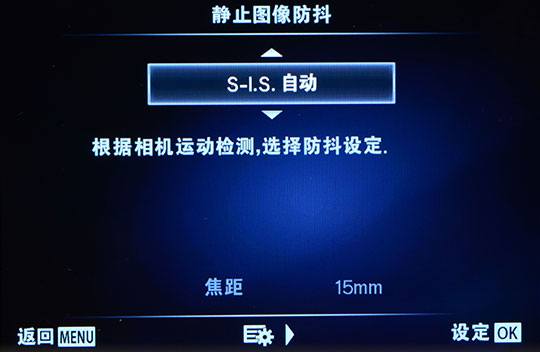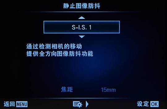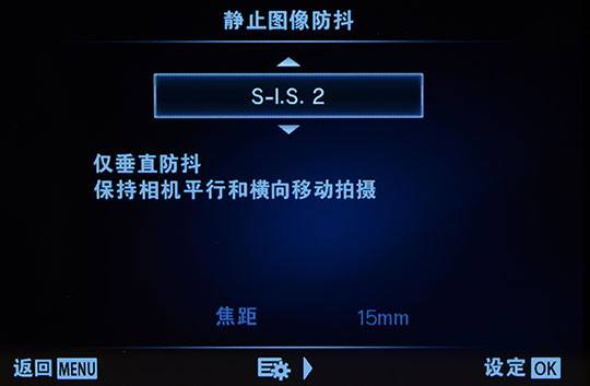 奥林巴斯内置的5轴防抖,除了S-I.S.自动,还有S-I.S.1指提供全方向防抖(E-M5默认设置)、S-I.S.2仅垂直防抖,保持相机平行和横向移动拍摄(如遥拍)、S-I.S.3仅横向防抖,保持相机垂直和水平平移拍摄。