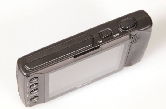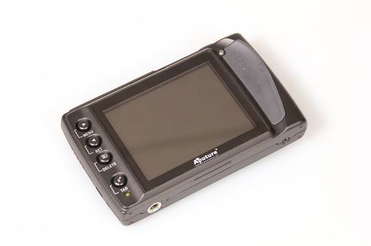 这套设备分为控制端和发射端两部分,我们先来看看控制端的情况:控制端配有一块3.5寸TFT-LCD液晶显示屏,分辨率为320x240。尺寸长宽高分别为127x79x30mm。从上图可以看到,控制端屏幕左侧有4个功能按钮,从上到下分别用于控制【菜单】、【设置】、【浏览图片/删除】、【休眠/切换频道】等功能。