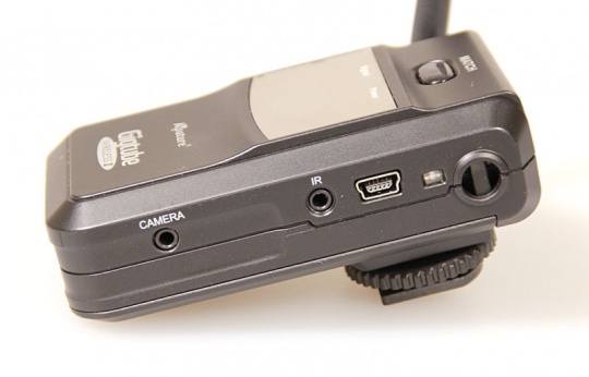 发射器左侧主要是各种接口,从左到右分别是连接相机的数据线接口、红外线接口以及充电接口及充电显示灯。