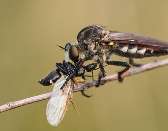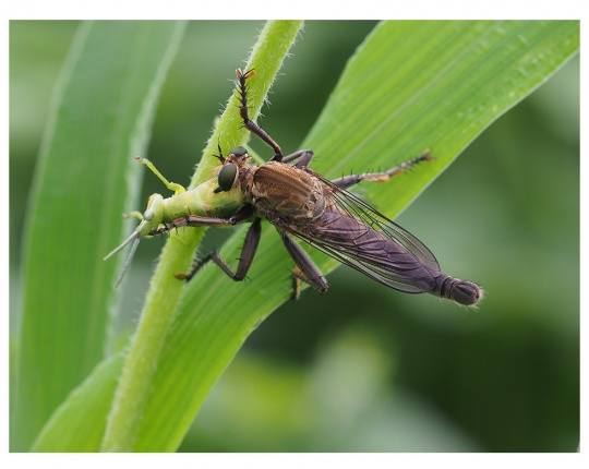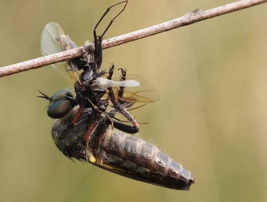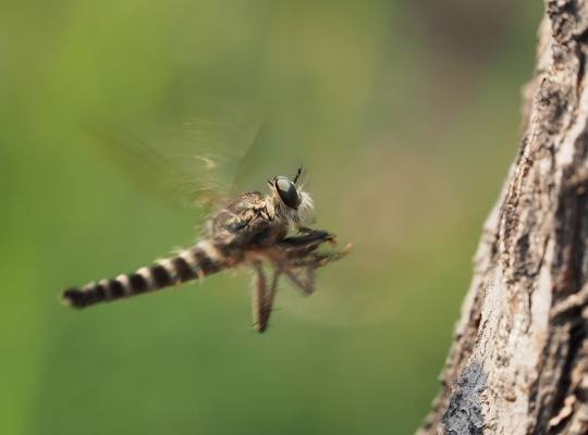 食虫虻这种东西很凶猛,专门捕捉飞行中的昆虫,它一般静卧在草上或树干上,昆虫在附近飞行经过时虻一跃而起,将昆虫牢牢抓住。虻眼睛周围布满了长毛是为保护眼睛不被挣扎的昆虫伤害,脚上的刺是为了不使捕获物逃脱。这东西要长牛那样大一定比老虎狮子厉害.奥巴75-300镜头加近摄镜