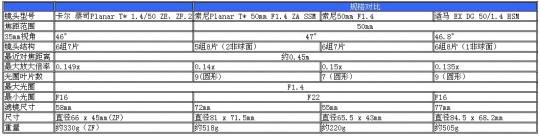 Planar T* 50mm F1.4 ZA SSM与适马、佳能、尼康的50mm F1.4镜头结构、MTF曲线对比